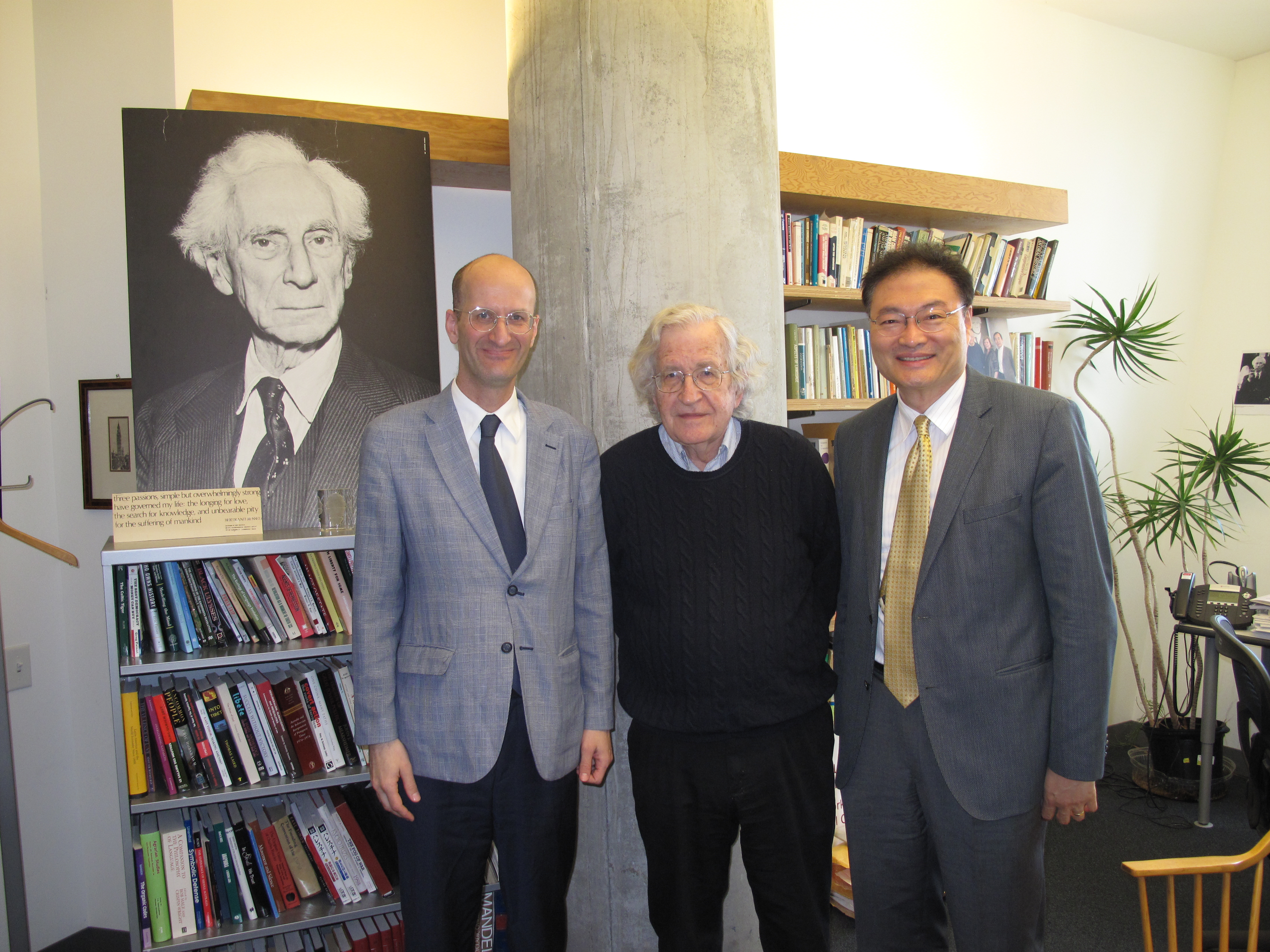 I corresponded with Noam Chomsky about five years ago frequently and started up the conversation again over the last few months. We had never had the occasion to meet in person, but on my recent visit to MIT as part of the larger effort to promote global collaboration in technology convergence I managed to meet him at his office. Here is a picture which includes also my close friend Eugene Pak of Seoul National University’s AICT (Advanced Institutes of Convergence Technology). A fourth member of the group is Bertrand Russell, logician, political activist and author of “Has Man a Future.” I read that book as a child when I found it in the library of my aunt Jeanne in Luxembourg. Clearly Noam has him included in all portraits taken to indicate the spirit behind what he is doing today.