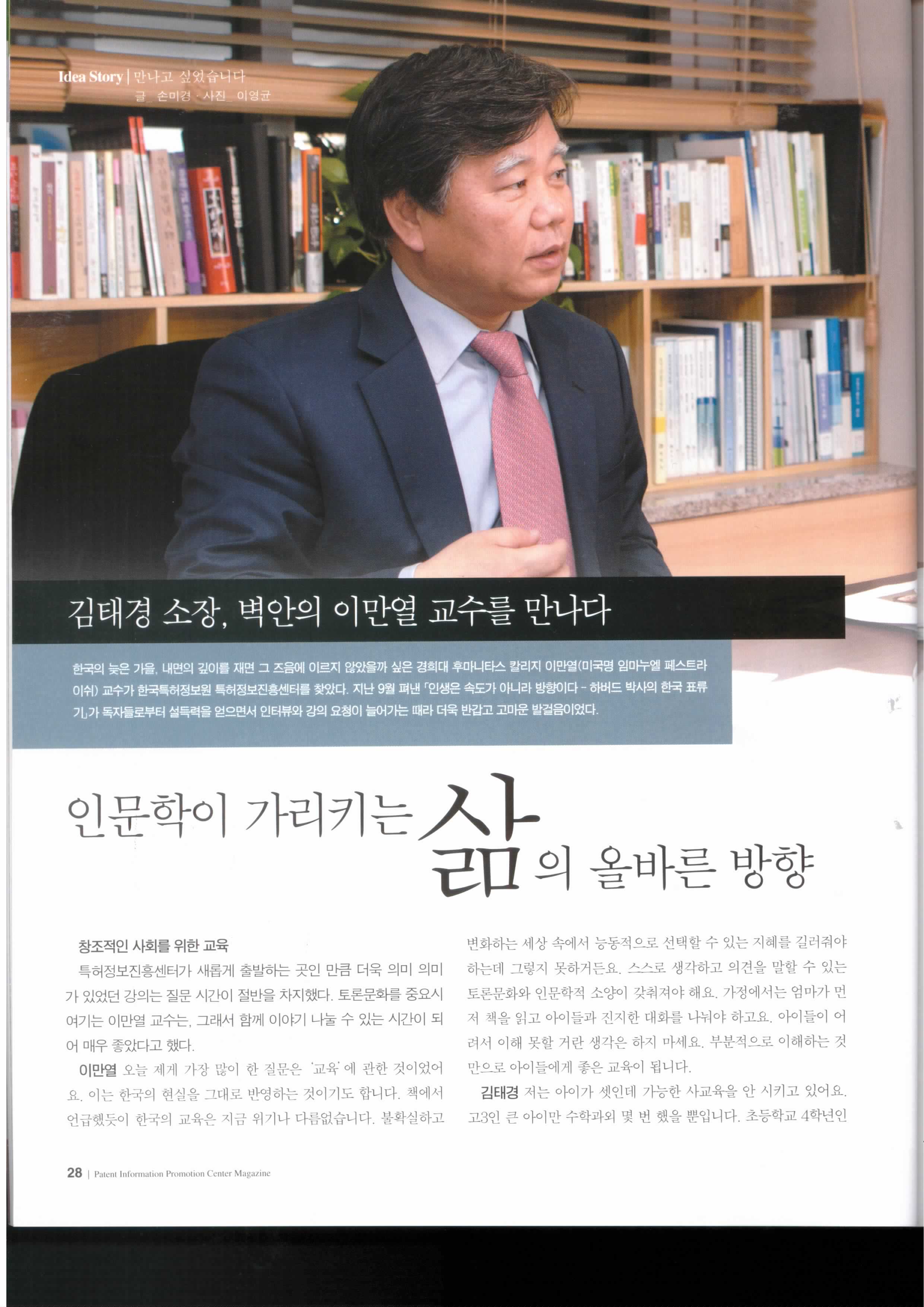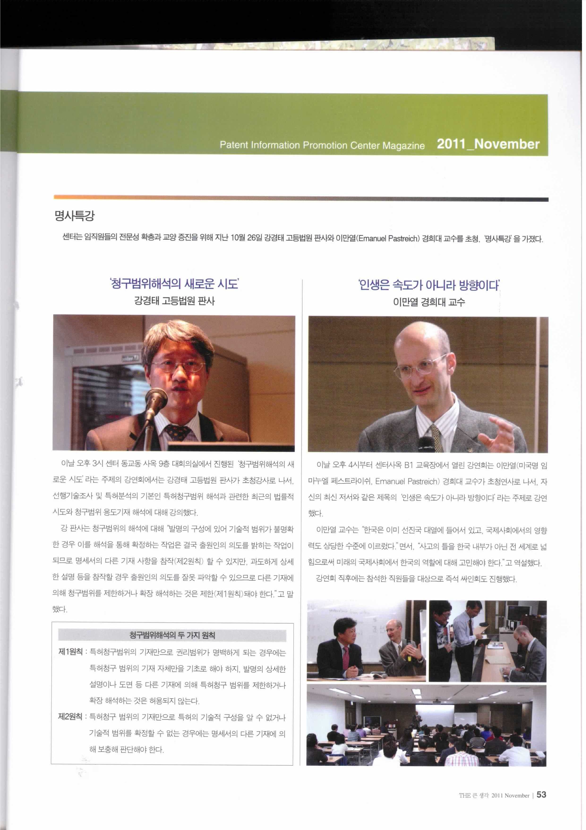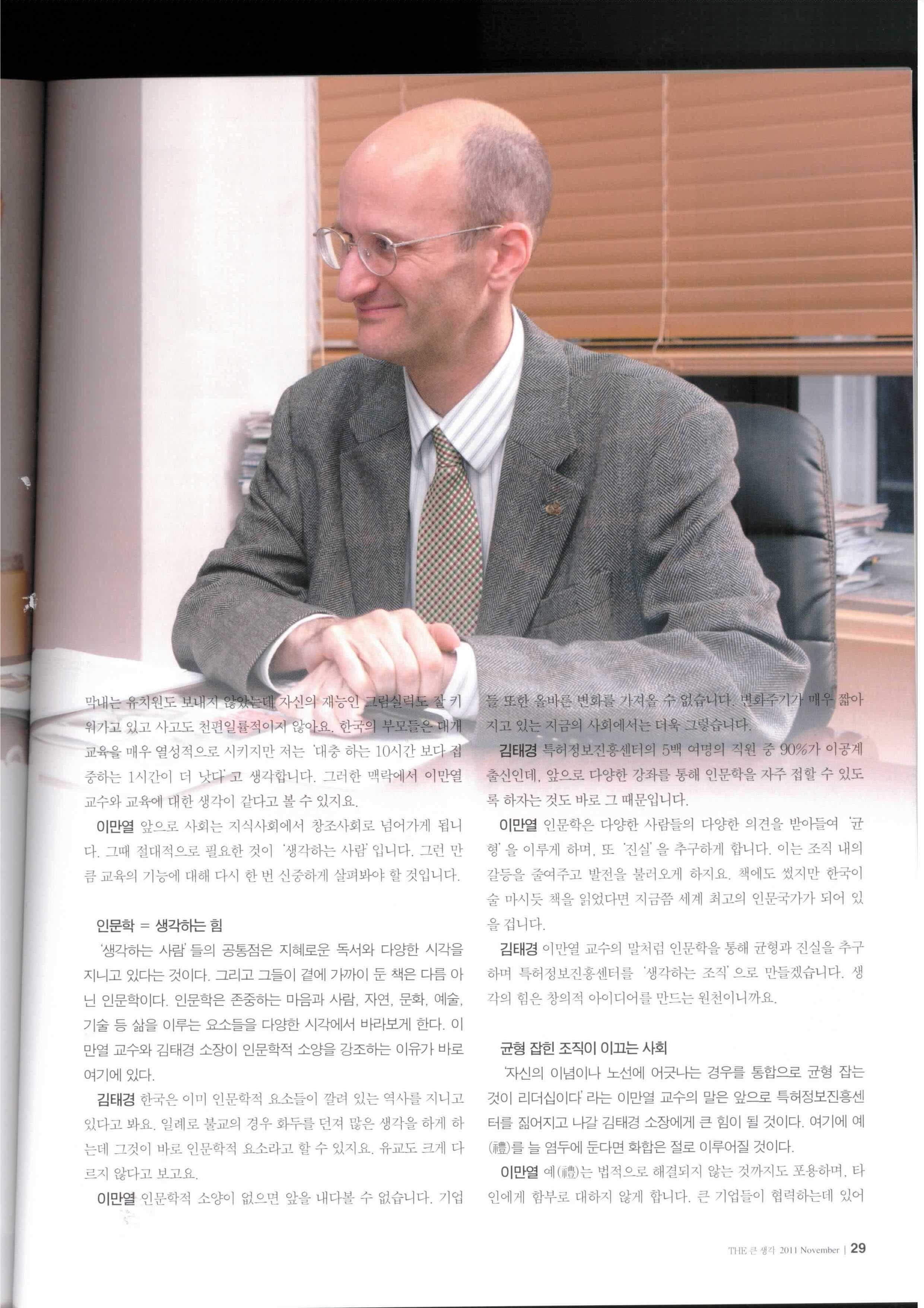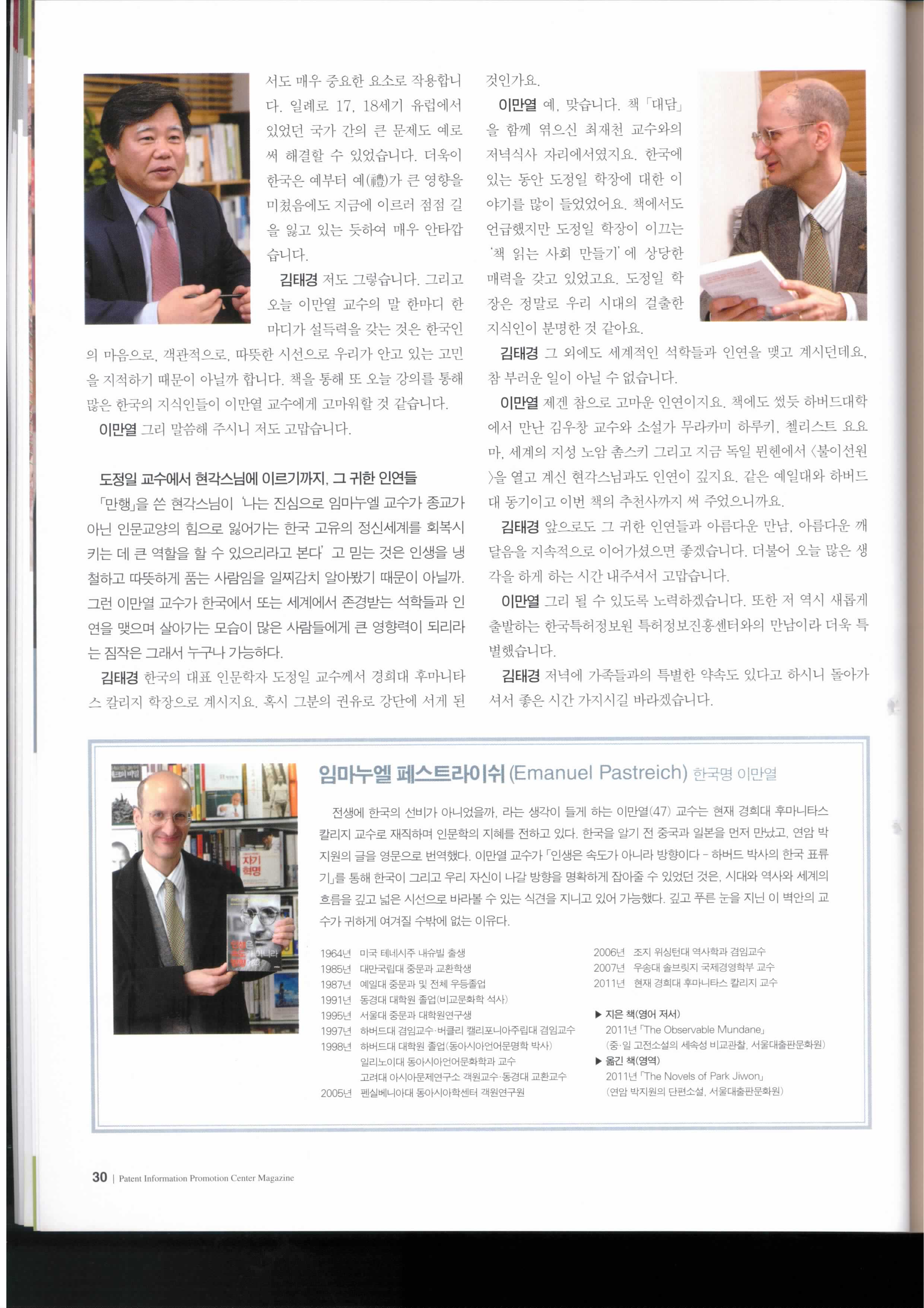 This article is an interview with Emanuel and Kim Taegyong (김태경 소장), Director of the Korea Institute of Patent Information (특허정보원 ), about education, technology and Korea’s future in the Monthly Journal, Patent Information Promotion Center Magazine (November, 2011).