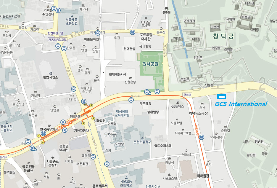 (Come out of exit 4 of Anguk Station and head straight for 400 meters; GCS building is across the street from the entrance to Changdok Palace)