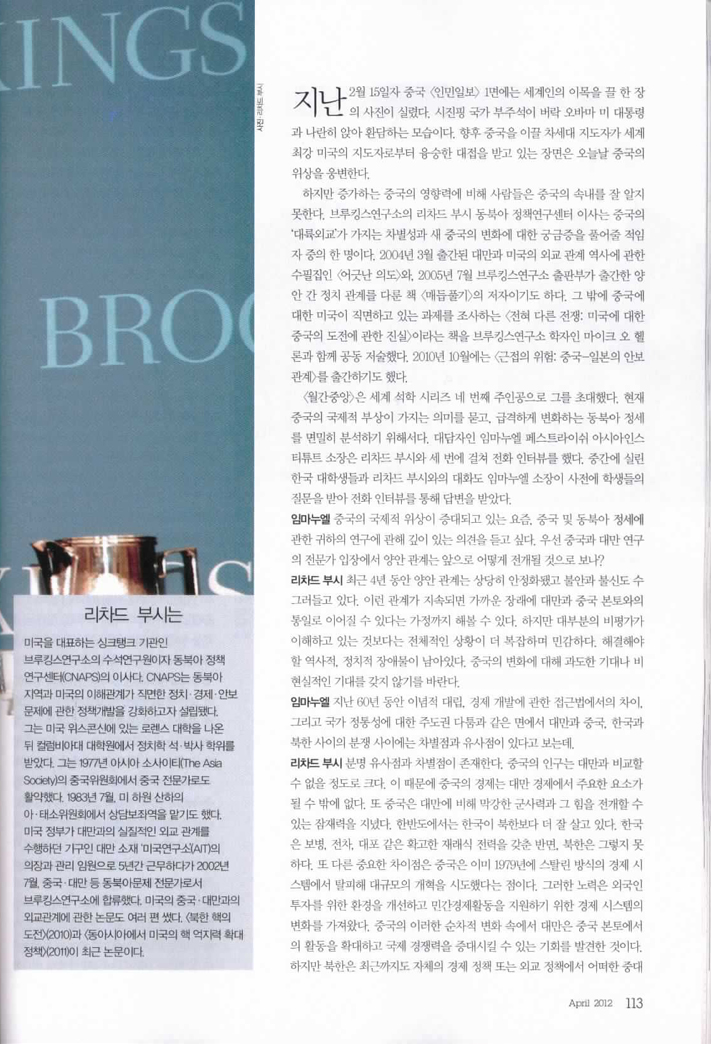 In this interview with Richard Bush, director of the Center for Northeast Asia Policy Studies at Brookings Institution in Washington D.C., we discuss recent developments in China and the important role of Korea in Northeast Asia and around the world.