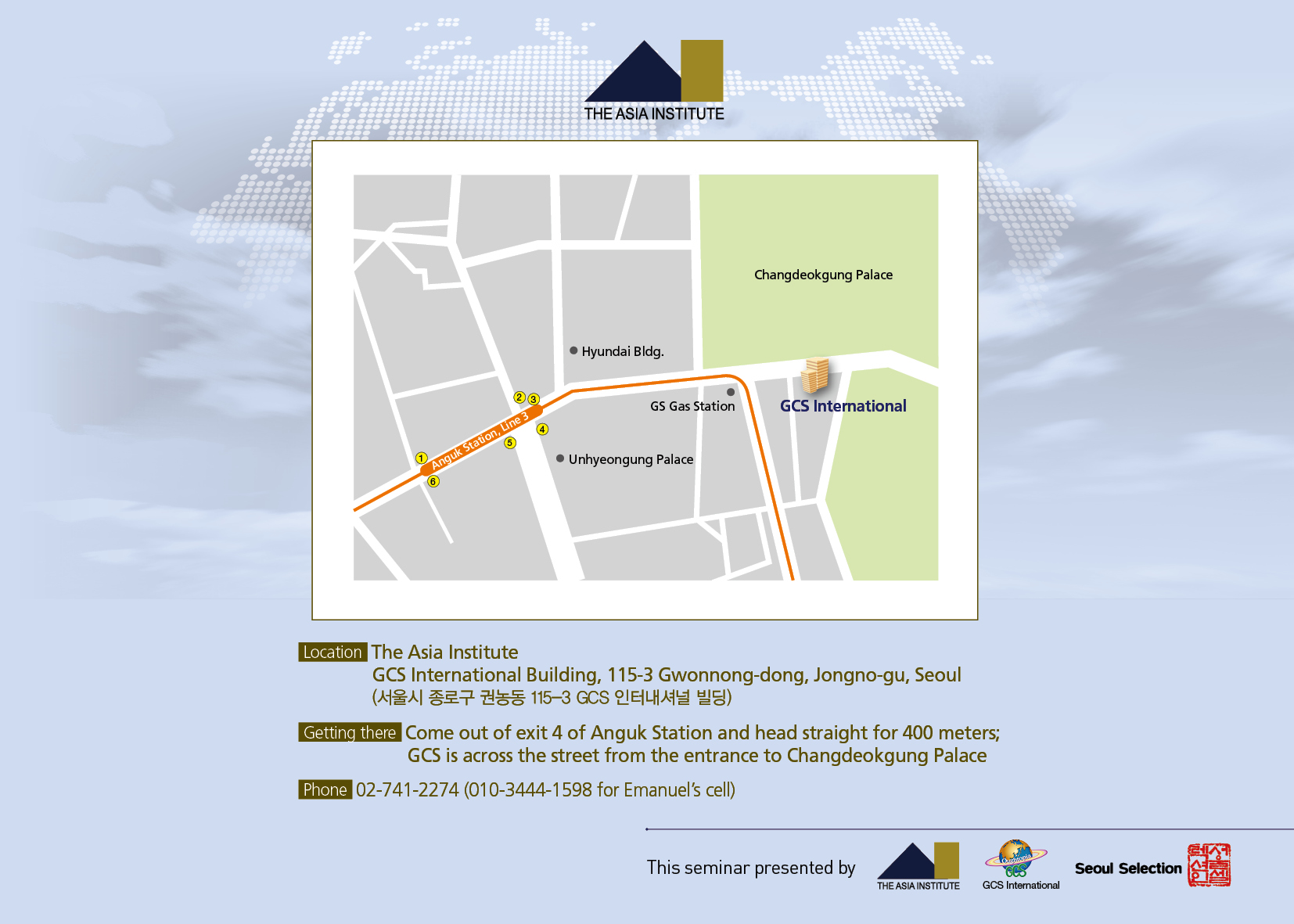 (Come out of exit 4 of Anguk Station and head straight for 400 meters; GCS building is across the street from the entrance to Changdok Palace)