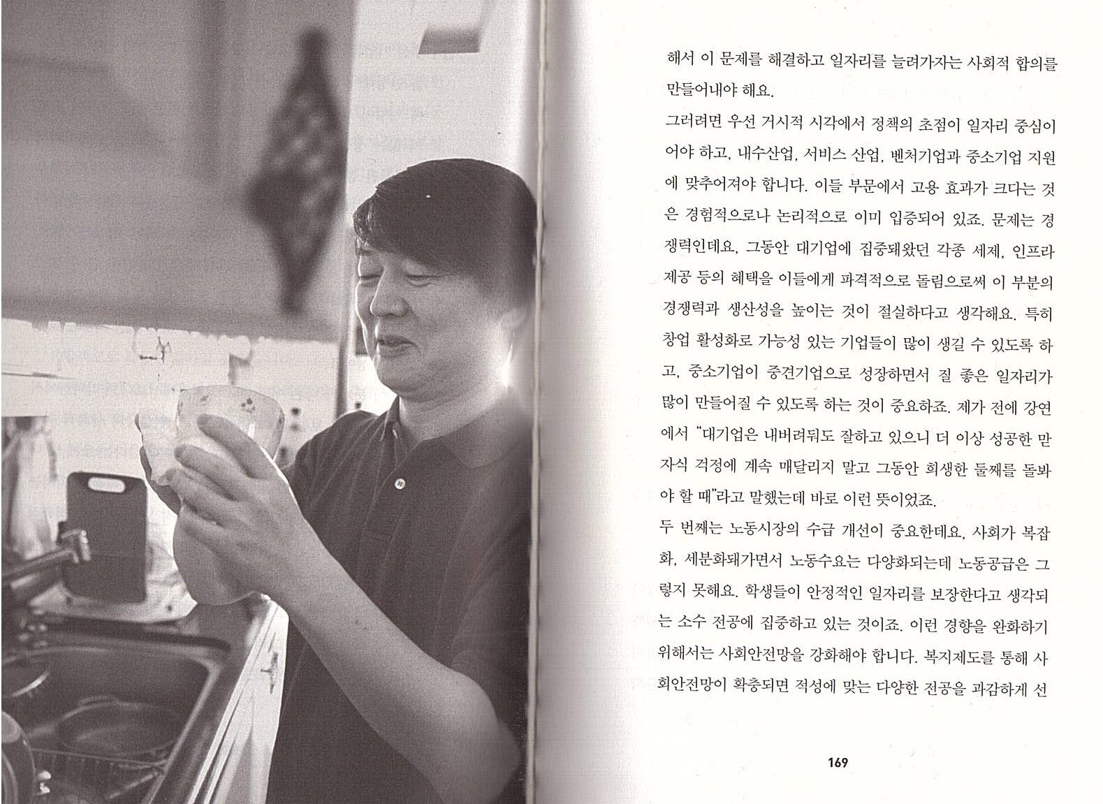 This photograph of Ahn washing dishes is perhaps the most significant. It serves to give an insight into his daily life, and also suggest a humility that cannot be found among privileged politicians who never wash dishes. Whether he actually washes dishes is another question.