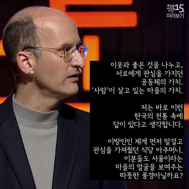 임마누엘 페스트라이쉬 아시아 인스티튜트 소장   ‘한국 사람들은 행복합니까?’ 한국에서 살고있는 임마누엘 페스트라이쉬 교수의 질문입니다. 높은 자살율, 우울증, 고독감.. 한국사회의 많은 문제점을 해결하기 위해 우리는 외국의 사례, 외국의 전문가들을 찾습니다. 하지만 임마누엘 교수는 오히려 한국 사회의 전통 문화 속에 그 해결책이 있다고 말합니다. 서울의 숨은 골목을 천천히 산책하듯이 그가 안내하는 또 다른 서울의 풍경을 만나봅니다. 외국인의 눈에 비친 한국, 서울, 그리고 소중한 공동체의 가치에 대한 이야기입니다.