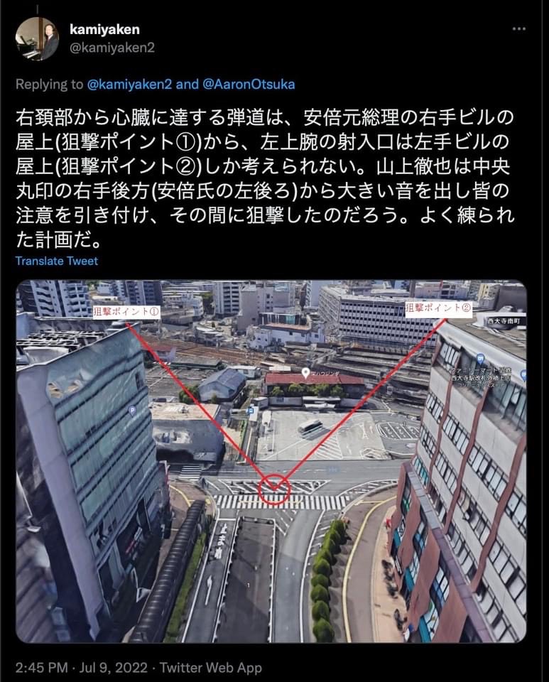 Bien que les médias grand public aient accepté cette histoire fantastique, la police et l’appareil de sécurité japonais n’ont pas réussi à écarter toutes autres interprétations. Le 10 juillet, le blogueur Takashi Kitagawa a publié des documents suggérant qu’Abe avait été abattu de face, et non de dos comme le faisait Yamagami, et que les coups de feu avaient dû être tirés en biais depuis le sommet de l’un, voire des deux, grands immeubles situés de part et d’autre du carrefour en face de la place de la gare.