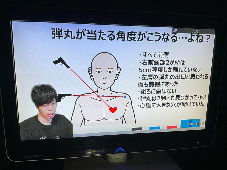 Les chances qu’un homme tenant une arme artisanale maladroite, se tenant à plus de cinq mètres dans une foule, soit capable de toucher Abe deux fois sont faibles. L’animateur de télévision Kozono Hiromi, lui-même expert en armes à feu, a fait remarquer dans son émission « Sukkiri » (le 12 juillet) qu’un tel exploit serait invraisemblable.