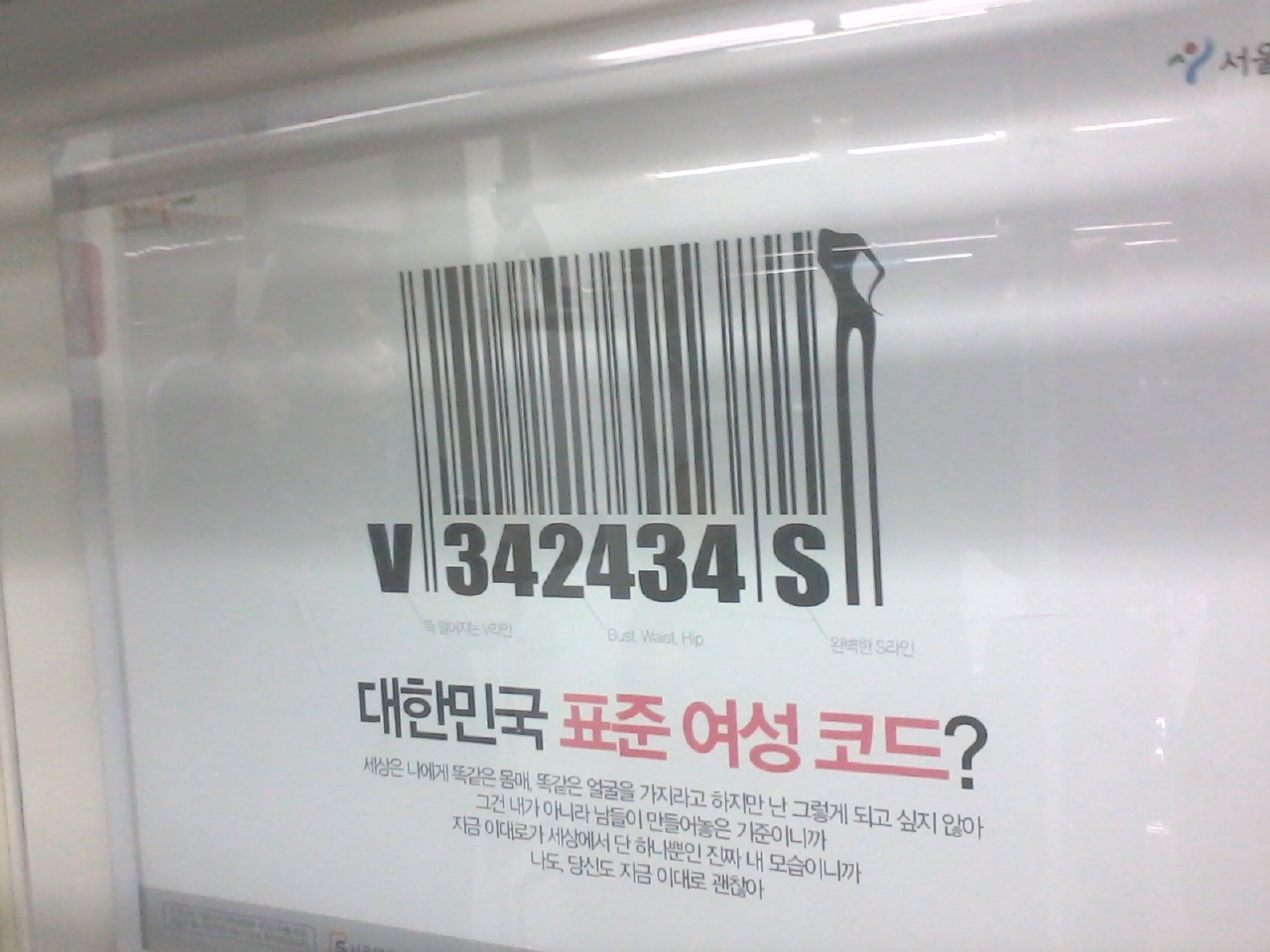 This remarkable public advertisement has appeared recently in the Seoul Metro and sponsored by the City of Seoul. The graphic is a modified bar code which is referred to as “The standard code for women in the Republic of Korea” beneath.