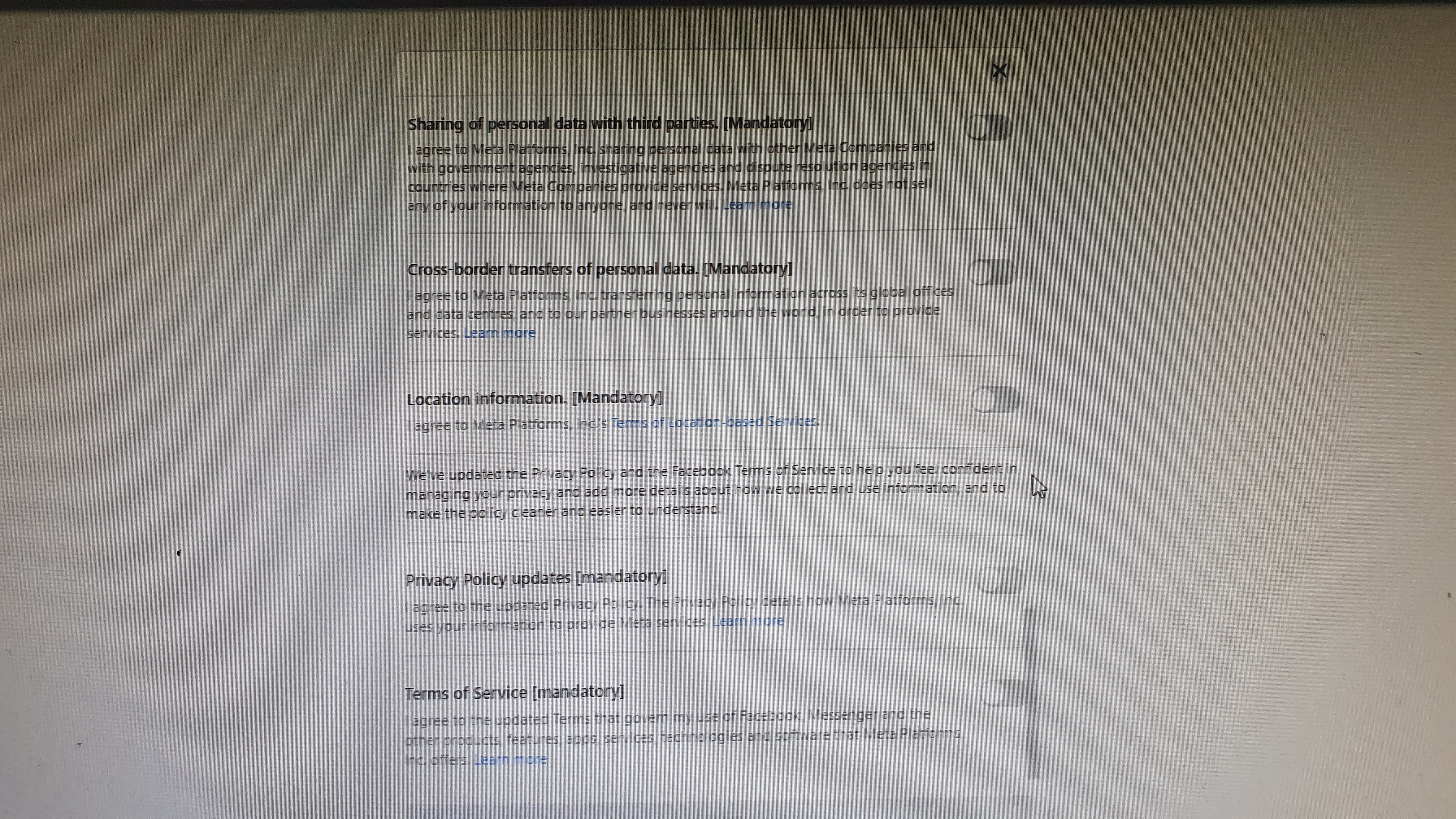 This recent set of required agreements with Facebook is typical of techno-fascism. I am required to agree to all of them if I want to use Facebook. The corporation will argue that I agreed to the contract, but in fact I was not given a choice. I was forced either not to be able to communicate, or to accept their fascistic rule.