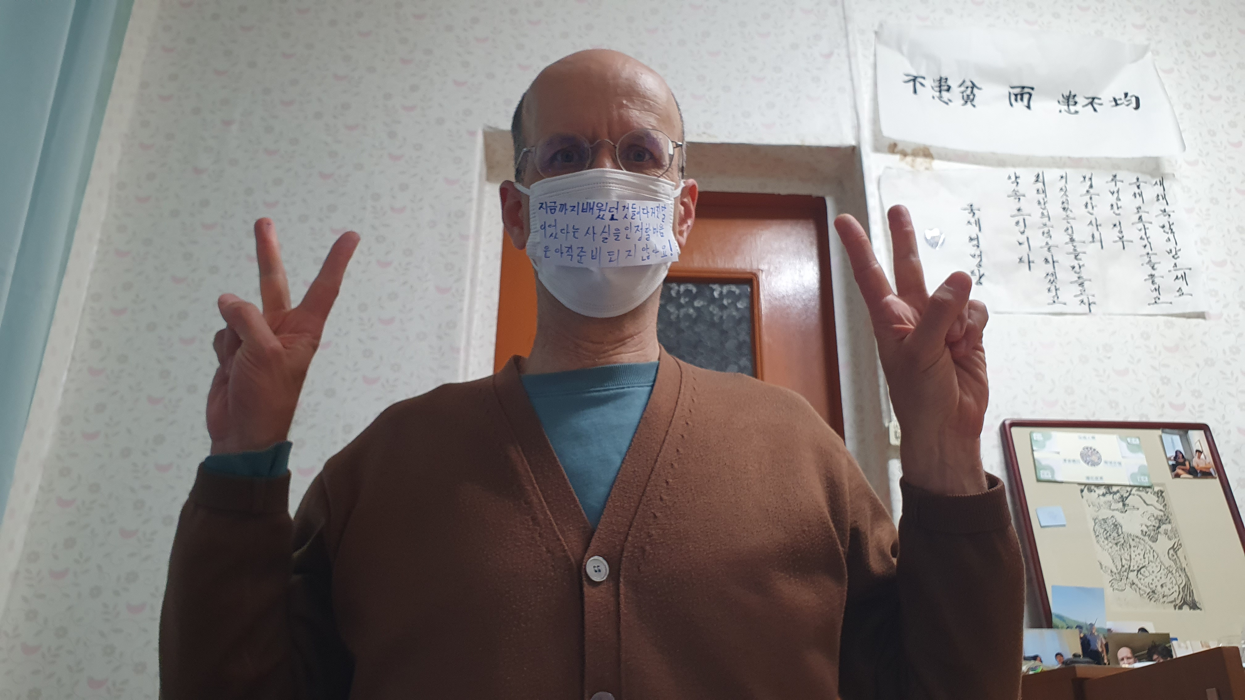 不待我们反应过来,朝鲜人便戴上了愚蠢的口罩,把无甚作用而且危害健康的消毒剂喷洒得到处都是。