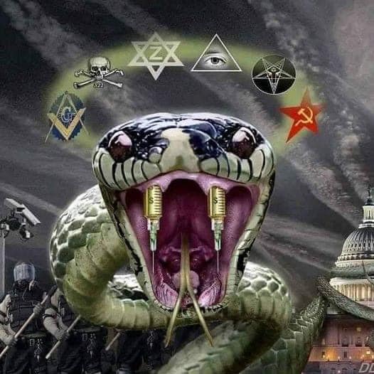 This part of the image makes sense. The problem is the five symbols that hover over the head of the snake’s head and represent the hidden powers that are behind the COVID 19 lockdown of the Earth.