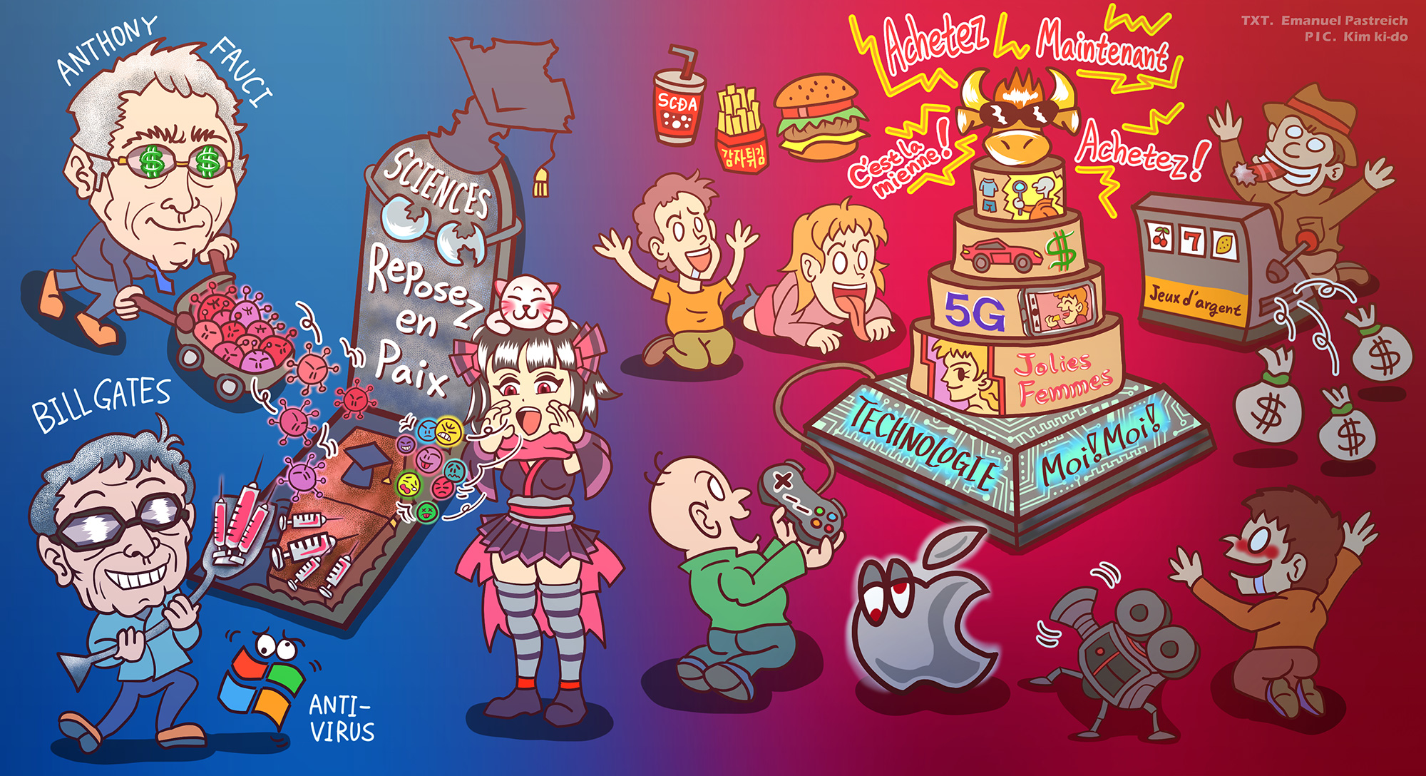 盖茨把他的基金会当作巩固自己“成就”的工具;跟他同流合污的,有他的富豪朋友,有被他劫持的监管部门,有他在各大制药公司、肮脏的能源公司、转基因食品公司、电信公司和大数据公司的合作伙伴,还有被他收买、愚蠢透顶、从盖茨之流给我们带来的无尽苦难中受益的记者。盖茨和他的亲信、拥趸和奴才们借疫情、气候变化和大规模物种灭绝煽风点火,散布恐慌,将盖茨对新技术,对只有他才能驾驭的新技术的憧憬作为救世良方。