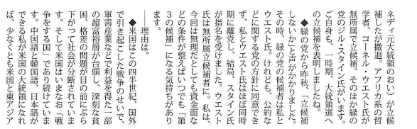 저는미국인들이미국에서진보정치의전통을되살리고, 우리헌법의완전한 잠재력을최대한실현하며, 토마스페인, 프레드릭더글라스, 소저너트루스, 수잔 B. 앤서니, 유진뎁스, 헨리월리스, 존 F. 케네디, 마틴루터킹이지킨자유와평등의횃불을계승할것을촉구합니다.