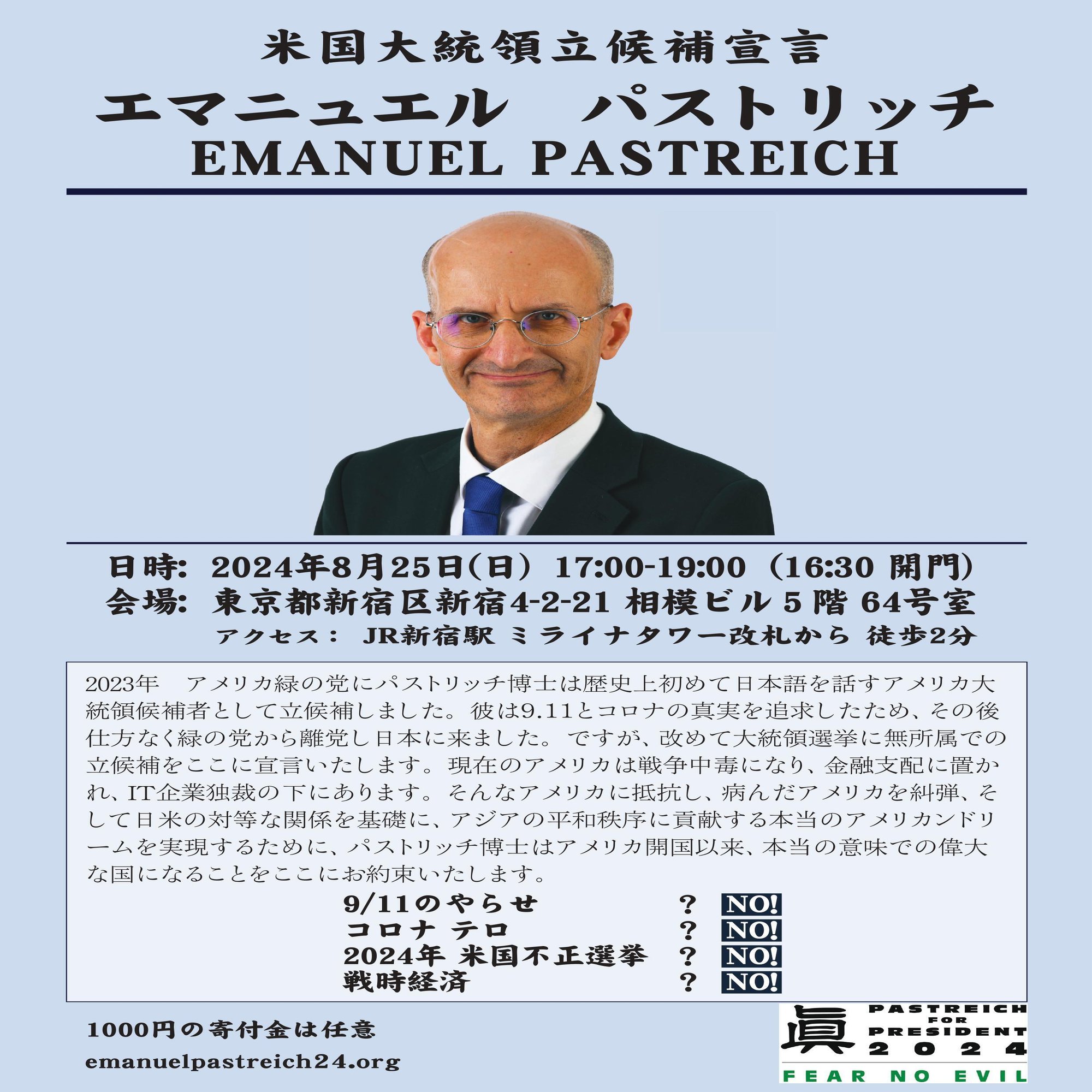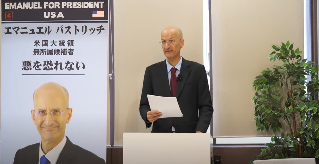 2023年 アメリカ緑の党にパストリッチ博士は歴史上初めて日本語を話すアメリカ大統領候補者として立候補しました。 彼は9.11とコロナの真実を追求したため、その後仕方なく緑の党から離党し日本に来ました。 ですが、改めて大統領選挙に無所属での立候補をここに宣言いたします。 現在のアメリカは戦争中毒になり、金融支配に置かれ、IT企業独裁の下にあります。 そんなアメリカに抵抗し、病んだアメリカを糾弾、そして日米の対等な関係を基礎に、アジアの平和秩序に貢献する本当のアメリカンドリームを実現するために、パストリッチ博士はアメリカ開国以来、本当の意味での偉大な国になることをここにお約束いたします。