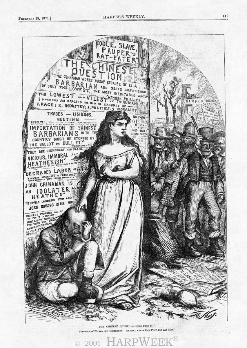Harpers Weekly The Chinese Question “Hands off, Gentlemen! America means fair play for all men.”