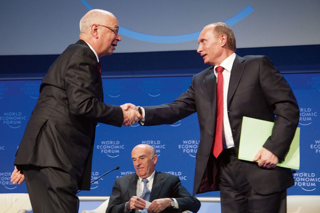 You might say that he has to work with the World Economic Forum, to shake hands with war criminals like Klaus Schaub, and to speak at Davos because he is president of Russia.