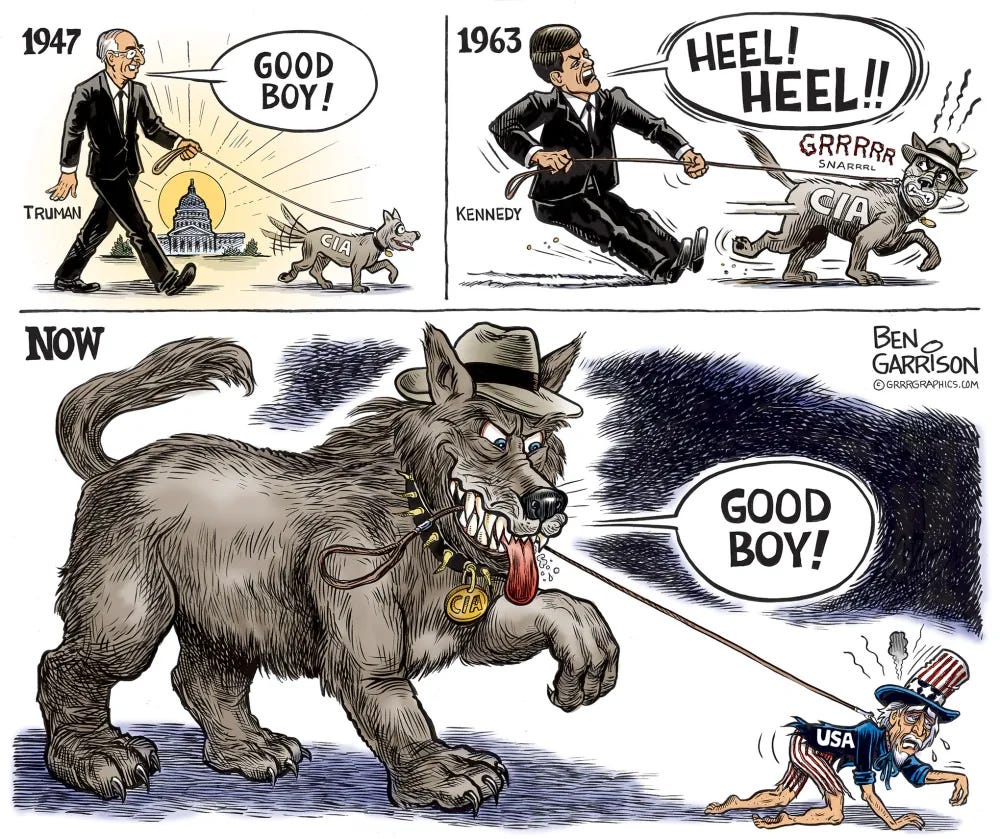This illustration of the evolution of the CIA might be better with a few more frames. I personally think that Harry Truman was not a bad president, but was totally over his head. The issue was rather how the desire of certain political figures to take up the mantle of the British Empire overwhelmed those who adhered to the Constitution and Declaration of Independence and thus the nation was set on the path to full-blown imperialism. One can make a constitutionalist argument, or a socialist argument. The conclusion is the same.