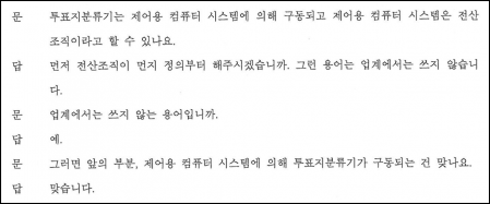 二. 변호인의 “제어용 컴퓨터 시스템에 의해 투표지분류기가 구동되는 건 맞나요”라는 말은 ‘컴퓨터 푸로구램(program)에 의하여 개표기가 구동되는가?’라는 뜻이다.
